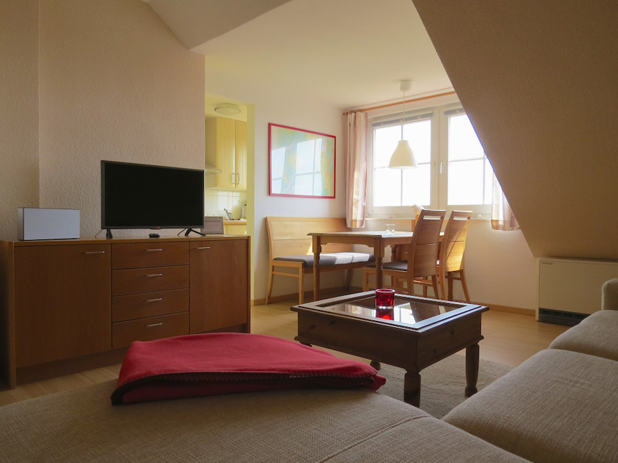 Wohnzimmer Relax-Couch, Couchtisch, Esstisch m. Sitzbank und 2 Stühlen, Sideboard, LED-SAT-TV, CD/Radio, Telefon, Laminatboden