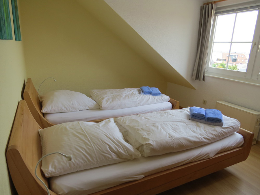 Schlafzimmer 2 Einzelbetten à 90x200cm (können auch zusammengestellt werden), Nachttisch, Stuhl, Kleiderschrank, Laminatboden