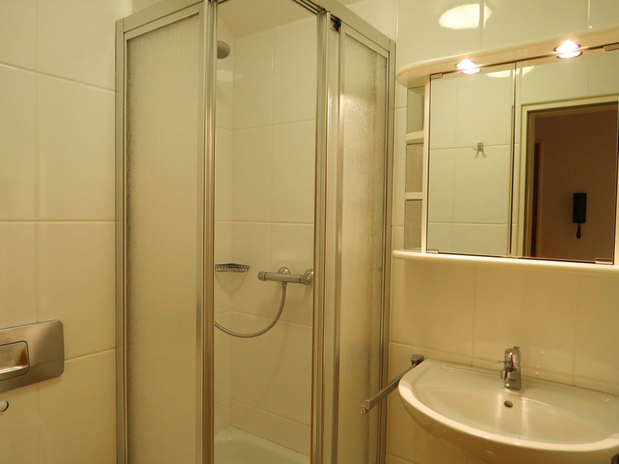 Bad Dusche m. Duschtrennwand, WC, Waschbecken, Föhn, Fliesen, Fußbodenheizung